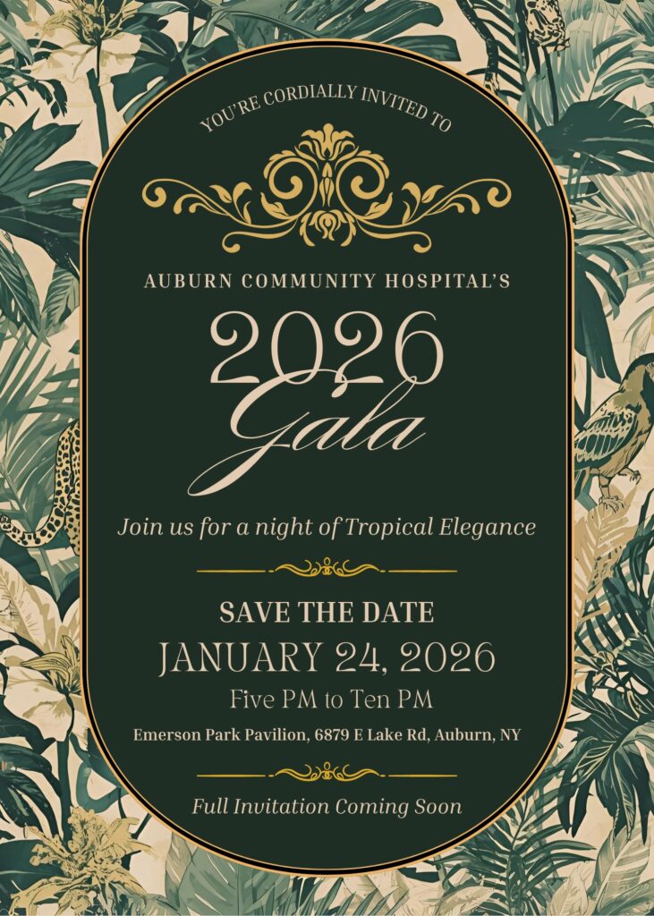Join us on Saturday January 25, 2026, as we invite you to escape the winter chill and embrace an evening of Tropical Elegance at our Annual Gala to benefit Auburn Community Hospital, hosted at the Emerson Park Pavilion in Auburn, NY.